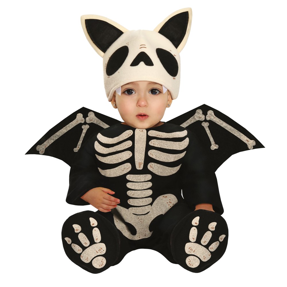 The skeleton bat costume for babies consists of a jumpsuit with wings and a hat. The baby skeleton jumpsuit is mostly black but has white bones printed on it. The wings and the hat make it an extraordinary bat costume for babies. With this Halloween jumpsuit, little bats can enjoy their first Halloween carefree!