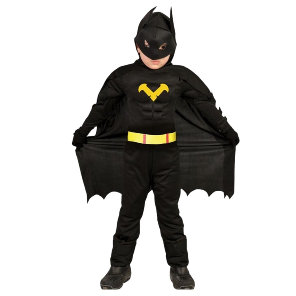 Batman costume for children, made of polyester material, mixed color. The component material is soft to the touch and does not cause skin irritation. This product is suitable for use by children aged 5-6 years with a height of 110 cm to 115 cm, bust 59-62 cm, waist 55-57 cm, hips 62-64 cm.