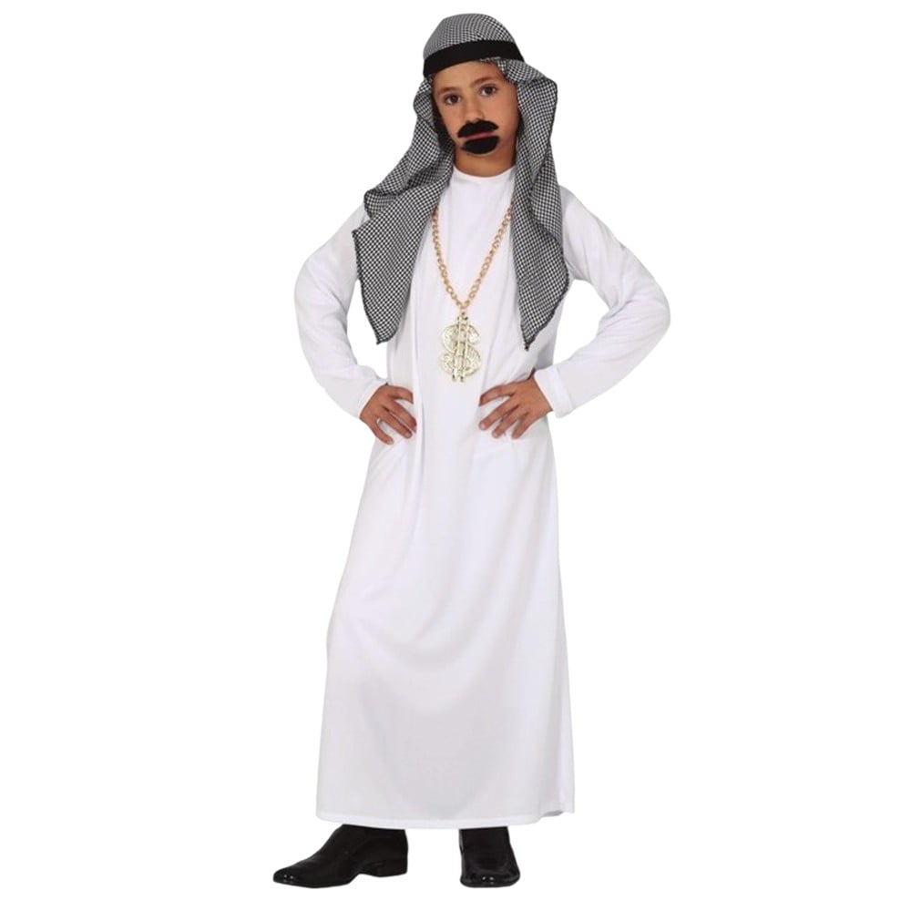 Sheik suit for children, made of polyester material, mixed color. The component material is soft to the touch and does not cause skin irritation. This product is suitable for use by children aged 7-9 years with a height of 125 cm to 135 cm, bust 67-70 cm, waist 59-60 cm, hips 67-72 cm.