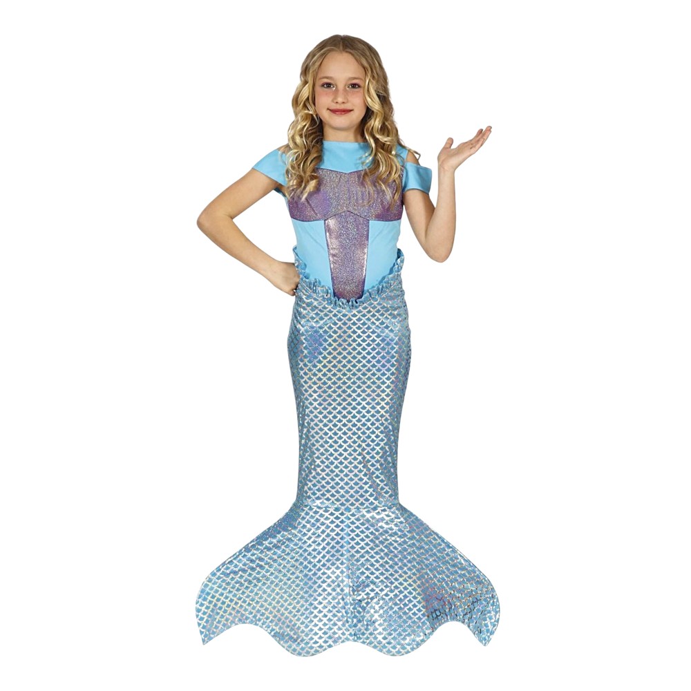 Mermaid costume for children, made of polyester material, mixed color. The component material is soft to the touch and does not cause skin irritation. This product is suitable for use by children aged 5-6 years with a height of 110 cm to 115 cm, bust 59-62 cm, waist 55-57 cm, hips 62-64 cm.