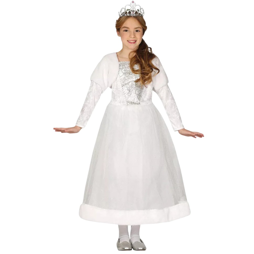 White princess costume for children, made of polyester material, mixed color. The component material is soft to the touch and does not cause skin irritation. This product is suitable for use by children aged 5-6 years with a height of 110 cm to 115 cm, bust 59-62 cm, waist 55-57 cm, hips 62-64 cm.