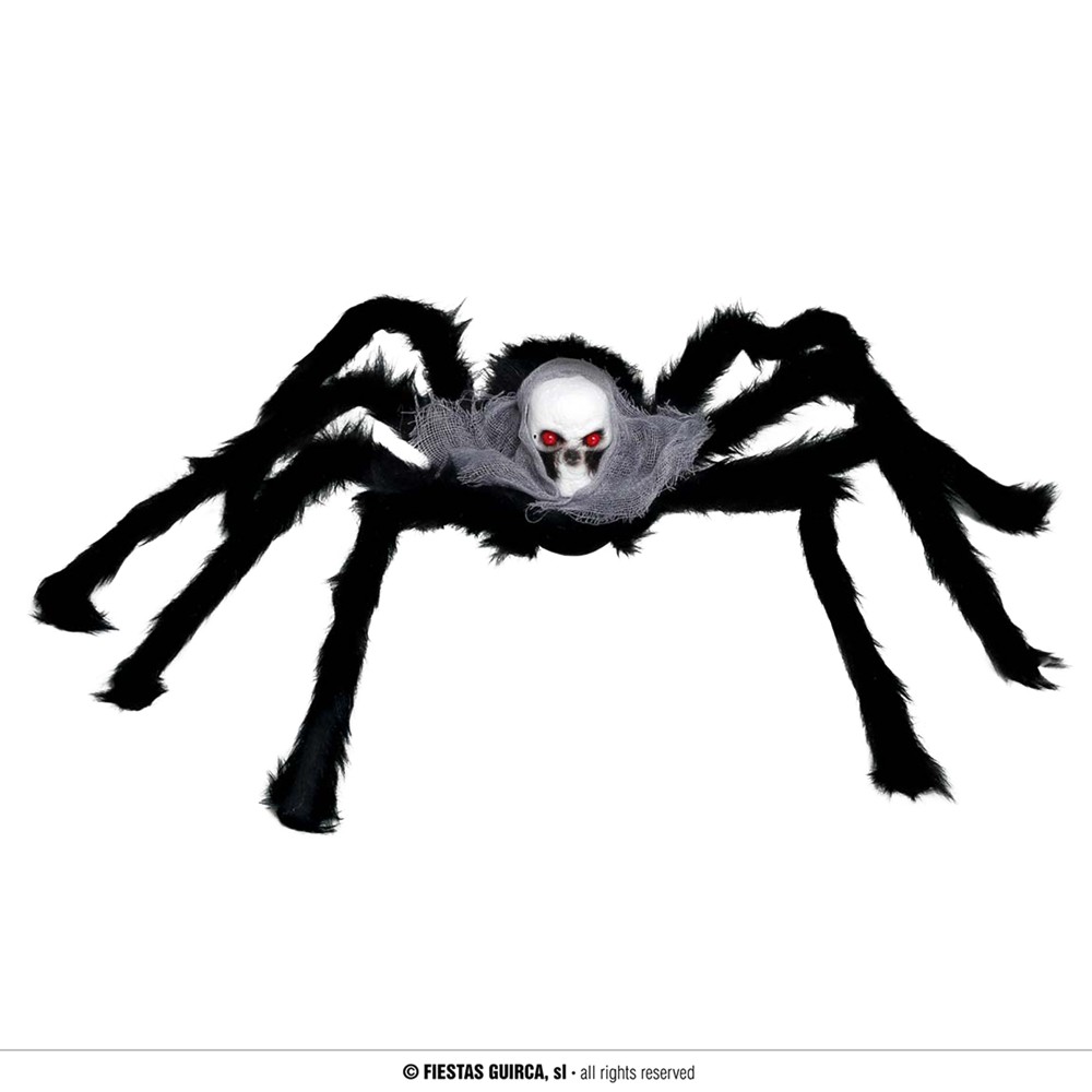 Scary and disgusting halloween decoration spider with a human skull and red eyes. This unique decoration will bring an authentic atmosphere of horror and mystery to your space. This intriguing combination evokes awe and wonder in every person who encounters this unusual decoration on the street. The black spider looks very authentic and its impressive size of 60 cm makes it not only an impressive decorative element for the Halloween party.