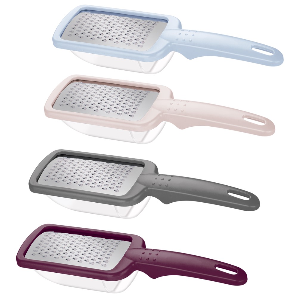 Plastic handheld grater with deposit. Easy to use, lightweight and very compact. Good quality at a competitive price.