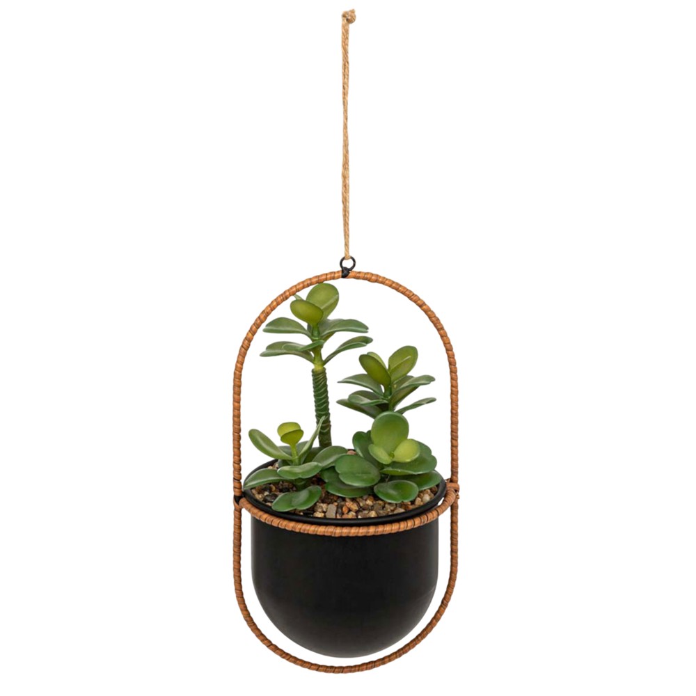 Decorative hanging vase with artificial plants. The plant is made of green plastic material, while the vase is black metal with beige details. There is a rope at the top for hanging. Use artificial plants to easily decorate your indoor or outdoor space.