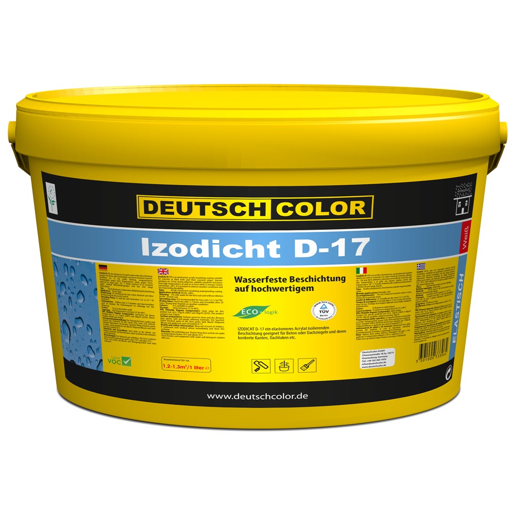 Izodicht D-17 is a hydroisolating coating with high content of elastomeric resins, suitable for the insulation of concrete surfaces, also it can be applied under tiles and roof tiles. It is characterized by very good adhesive properties in all types of surfaces. It ensures a high resistance against high temperatures and frost.It is resistant to extreme weather conditions, thus retaining its elasticity in changeable temperatures.