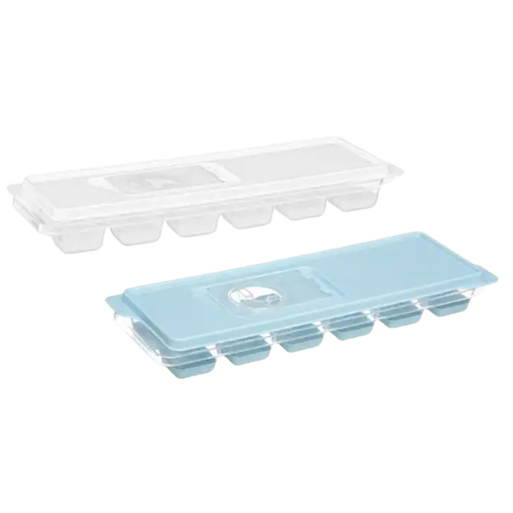 Ice box with 12 seats made of plastic material. It has a cap to fill with water and silicone on the bottom to press and pop the ice cubes easily. Easy to wash in the dishwasher.