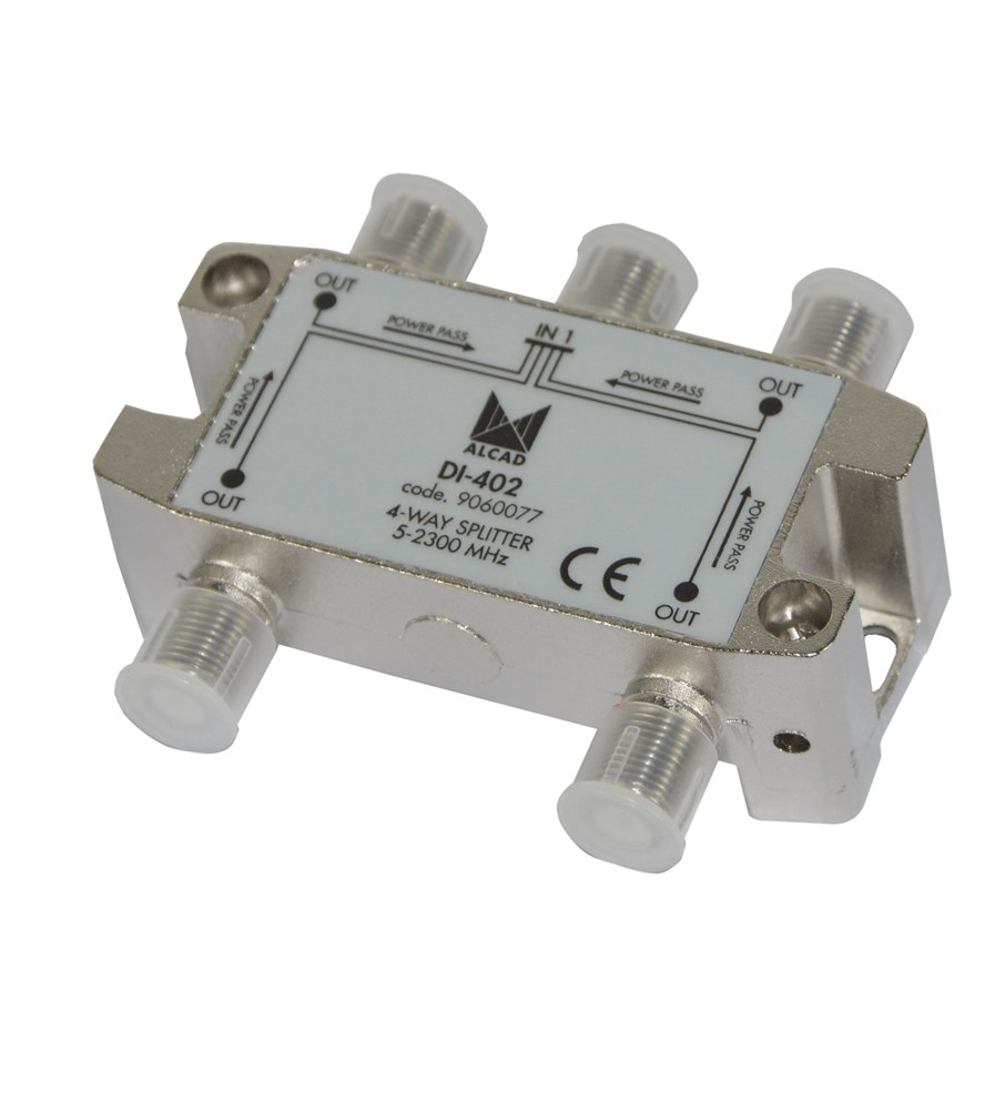 IF splitter 4 output with D.C. path. Splitters for terrestrial and satellite TV, covering all frequencies from 5MHz to 2,300MHz. They distribute all the input signal in equal parts among their outputs.They have a feed path through any of their outputs to the input.The response of the outputs is flat. Available with 2, 3, 4, 6 or 8 outputs.