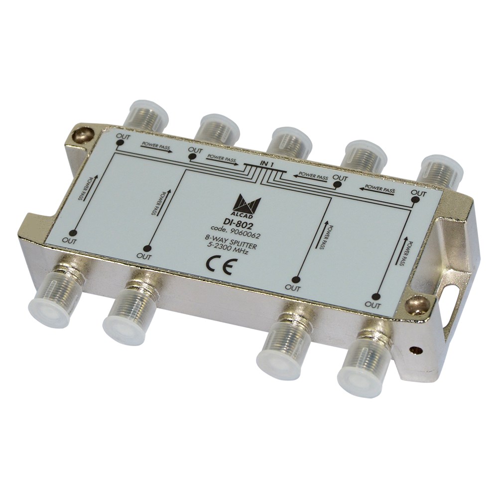 IF splitter 8 output with D.C. path 9060062. Splitters for terrestrial and satellite TV, covering all frequencies from 5MHz to 2,300MHz. They distribute all the input signal in equal parts among their outputs.They have a feed path through any of their outputs to the input.The response of the outputs is flat. Available with 2, 3, 4, 6 or 8 outputs.