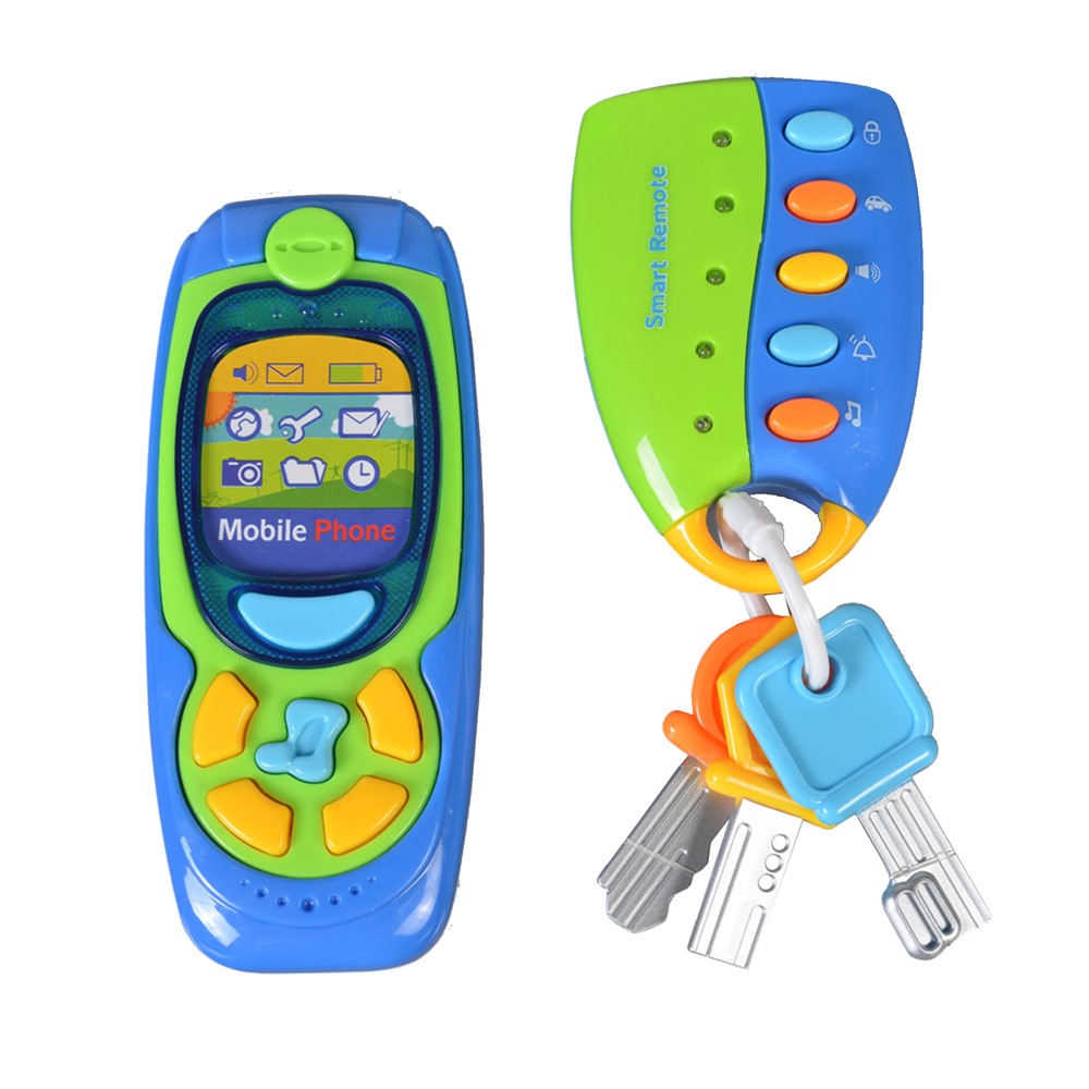 Interactive toy set for children, which includes a mobile phone with music and lights and a pair of keys with keychain, made of plastic material, in a colorful design. The set can be used by children for play, it stimulates the visual and auditory perception of the child, it helps with the coordination of the eyes and hands and it contributes to the easier recognition of different shapes and colors. This product is suitable for children over 12 months.