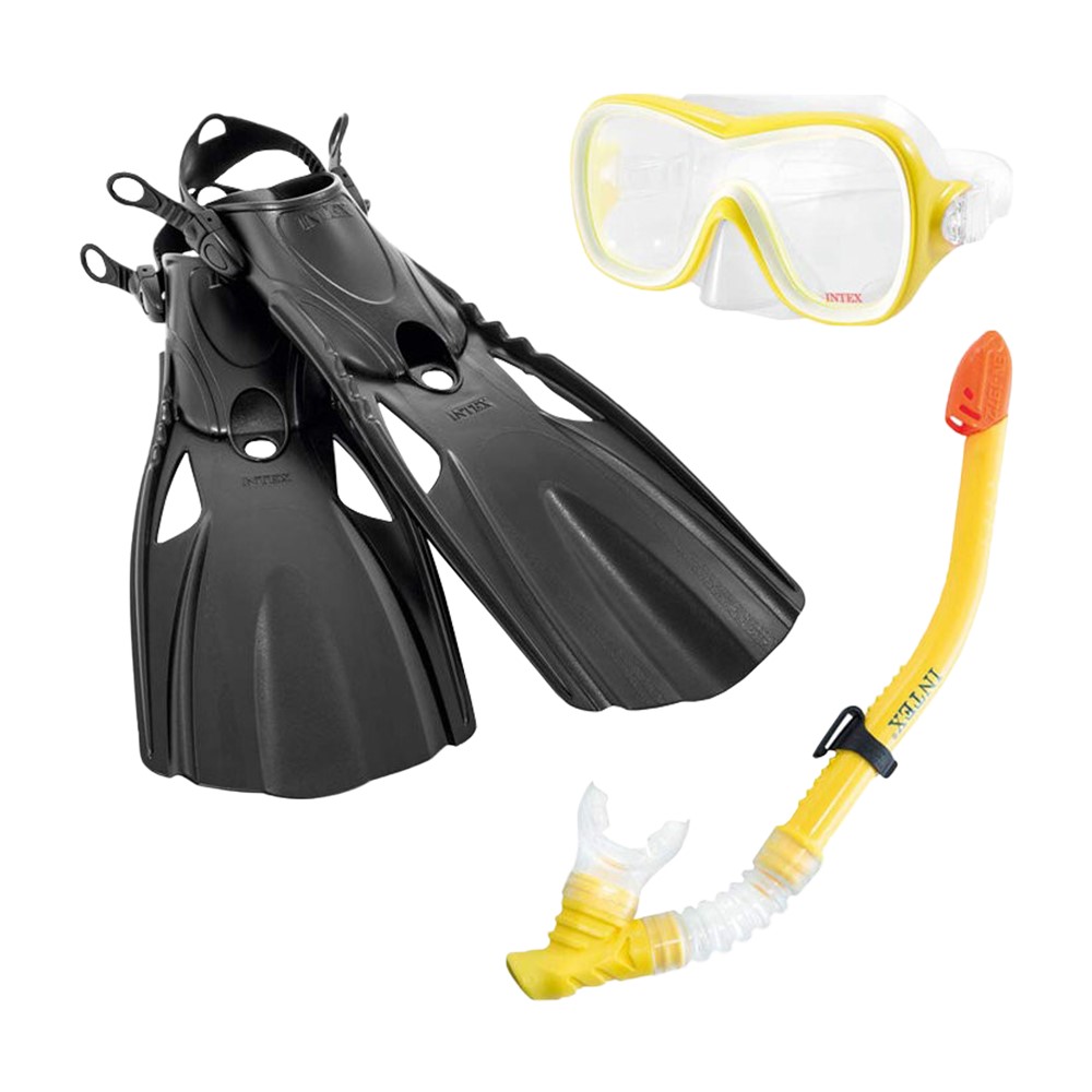 Discover the depths of the deep blue sea, or at least what's below the surface of your backyard pool with the Intex Reef Rider Youth/Adult Goggle Snorkel Mask. This goggle mask, snorkel, and flipper trio are perfect for swimming laps or exploring waters. You'll be able to keep splashing around swiftly without the need to come up for air every couple seconds. Polycarbonate lenses and the hypoallergenic rubber skirt on the mask keep your eyes water free while letting you see and swim comfortably. This set is ideal for anyone ages 14 and up.