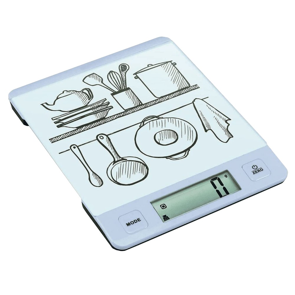 Kitchen scale Melchioni with glass plate. High precision sensor. Plate in 4mm thick tempered glass. Large 58x27mm LCD display. Volume measurement for water / milk / oil. Capacity: 10kg. Unit of measurement: gr/ml. Overload indication and battery status. Battery powered (1 x CR2032)