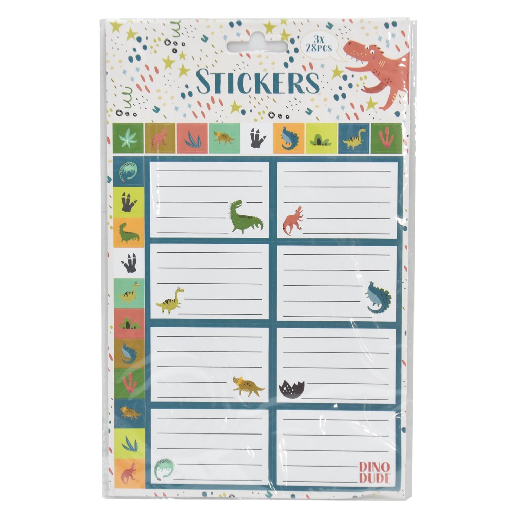 White multifunctional adhesive labels with dinosaur design. You can use them to name your books. notebooks or folders. A necessary tool for school.