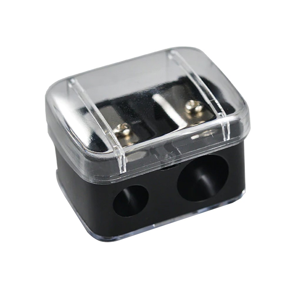 Pencil sharpener, made of durable plastic material and metal blade, with a height of 5 cm, in black color. The pencil sharpener is equipped with a 0.8 cm diameter socket, with a 1.2 cm diameter socket and with a cartridge to carry pencil splinters. It is used for sharpening lip and eye pencils, without damaging their shape and without breaking the tips of the pencils.