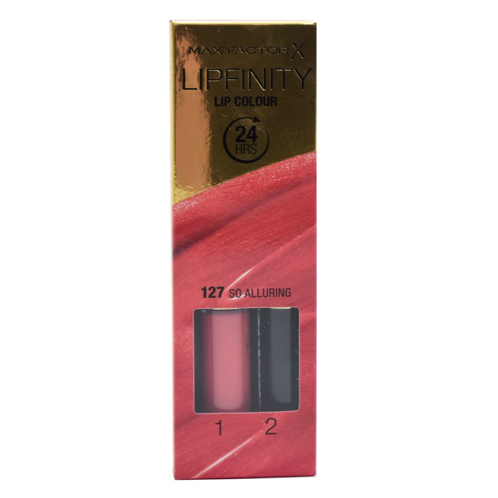 Makeup set of liquid lipstick, 127 So Alluring, in terracotta red color, and moisturizing lip balm, in transparent color. The lipstick is equipped with a fine-tipped applicator and it is used to enhance the color of the lips and define the contours of the lips, with an effect that can last up to 24 hours. The moisturizing lip balm has a dermatologically tested hypoallergenic formula, which has a nourishing and soothing effect on the skin of the lips, and it can be applied after the liquid lipstick to protect the lip color and hydrate the lips. This product is lightweight and practical, it does not contain toxic ingredients that can be harmful to the skin and it is suitable for use on all skin types.
