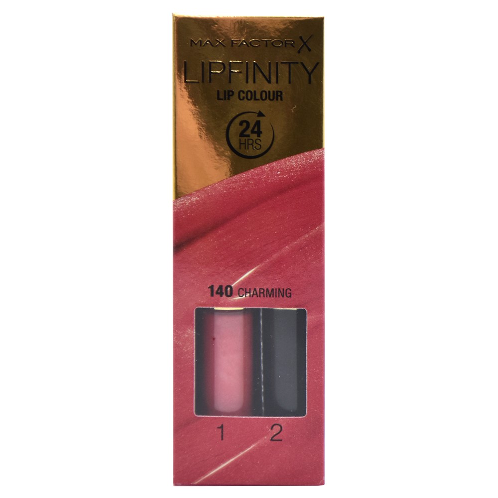 Liquid lipstick and moisturizing balm set, 140 Charming, LipFinity, 2-step Long Lasting, Max Factor, plastic, 2.3 ml + 1.9 g, dark pink, 2 pieces