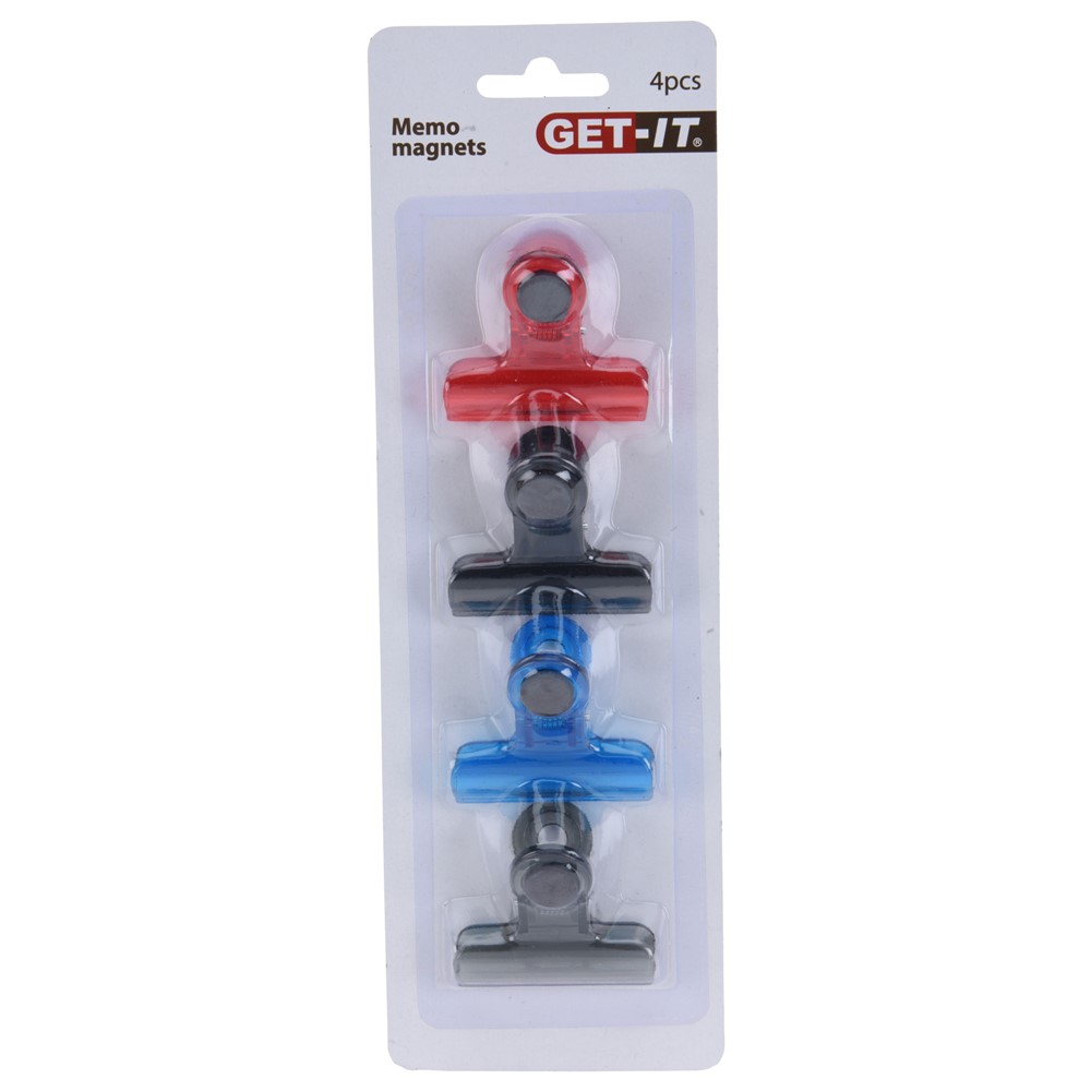 Magnetic paper clips made of plastic material, in a package of 4 pieces. Used to hang notes in the fridge, or to close open bags such as spice bags.