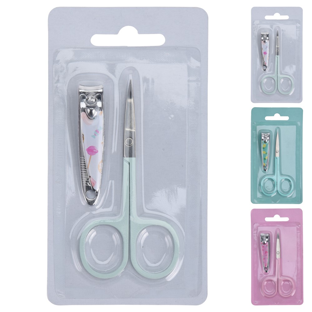 Manicure set, made of metallic material, in different colors and designs. The set contains a pair of small scissors, made of durable stainless steel material, and a nail clipper, equipped with a file, for modeling the nails, and a cuticle pusher. The set can be used for cutting nails, cutting and pushing the cuticles, modeling the nails and fixing broken nails. This product has small dimensions, which make it suitable to take with you on trips.