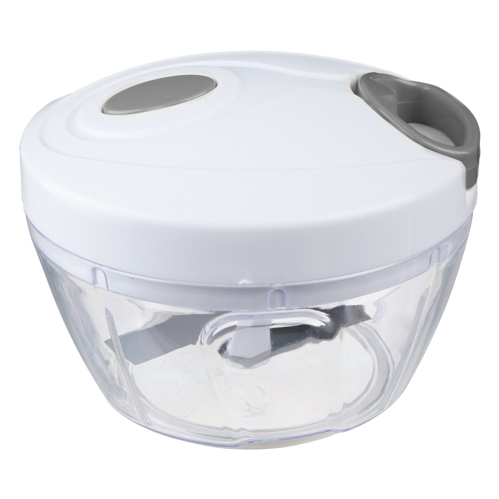 Manual vegetable shredder made of transparent plastic and stainless steel knives. Ideal for mincing and keeping your vegetables fresh on any day of the year.