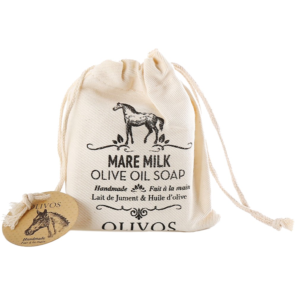 Soap in canvas bag, which contains extra virgin olive oil and mare milk, with nutritional value for the skin. It can be used to treat many skin problems such as acne, psoriasis, dry skin and other problems, it fights the first signs of aging, retains the skin's natural moisture, soothes and moisturizes dry and sensitive skin, and it is rich in vitamins, minerals and iron. This soap can be used on body, face and hair and it is suitable for use on dry and sensitive skin.