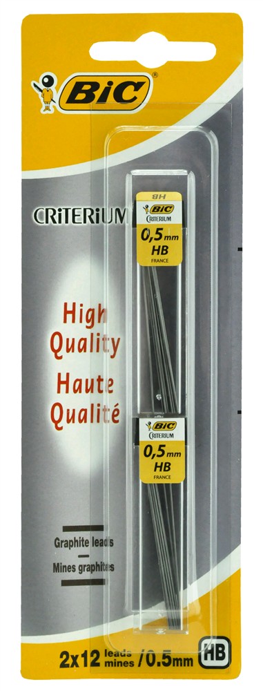 Mechanical pen leads, made of non-toxic graphite material, 0.5 mm in diameter, with HB line hardness. The package includes 2 small boxes of plastic material, which contain 12 mechanical pen leads each. This product is suitable for professional and non-professional use and it works with 0.5 mm diameter lead mechanical pens (780759, 51275, 51272, 55668, 55521).