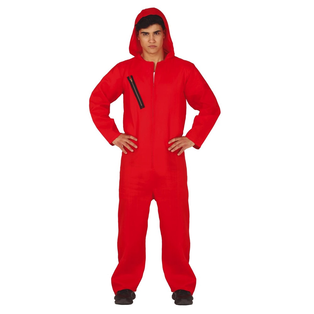 The most themed suit The bank robber in the movie La casa de papel, the suit is like a long-sleeved overalls with a red hood, made of 100% polyester material. Dimensions L (22-54). Suitable for adults.