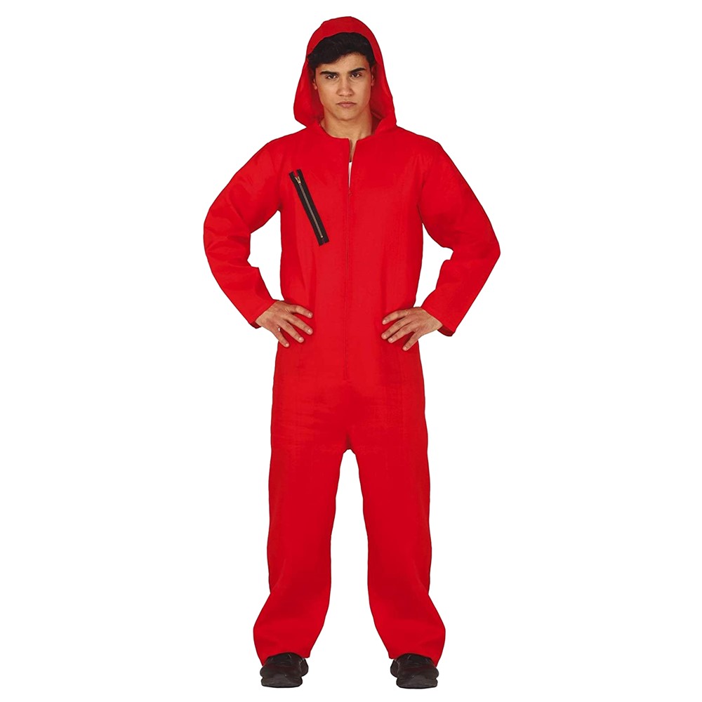The most themed suit The bank robber in the movie La casa de papel, the suit is like a long-sleeved overalls with a red hood, made of 100% polyester material. Dimensions M (48-50). Suitable for adults.
