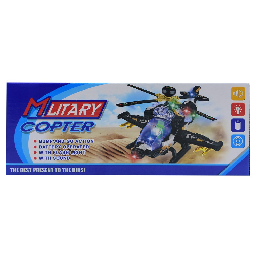 Military toy helicopter for children, made of plastic material, with colorful flashy lights and with music, equipped with a movement system that allows the toy to change direction if it bumps into an obstacle. It operates with 3 1.5 V AA batteries, which are not included in the package. This toy helps to develop the imagination, stimulates the development of the sensory skills and the development of learning and perception skills in children. The constituent material and paint have no content that can be toxic or harmful for children and the product is certified for safety in use. This product is suitable for use by children over 3 years old.