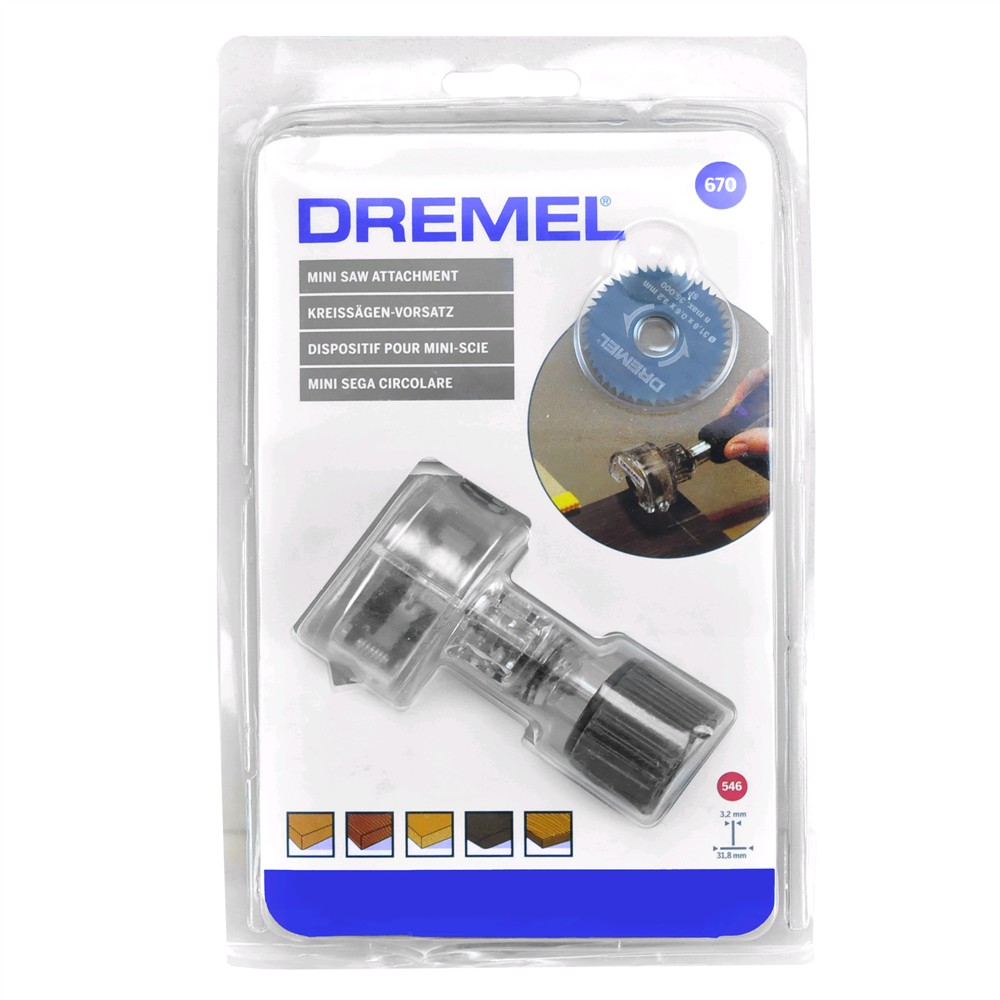Circular saw attachment device 670.To cut cleanly through wood – quickly and safely up to 6.35mm. Simply mount this attachment on a DREMEL multifunction tool and you have a mini circular saw.