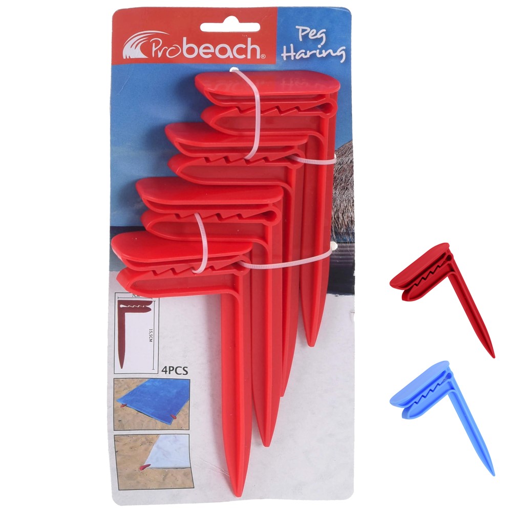 Multi-purpose fixing pegs, made of durable plastic material, with dimensions of 15.5 cm in length, in different colors. They are used for assembling camping tents, fixing protective layers for camping mattresses or fixing towels or blankets, to protect them from the wind. This product has compact dimensions, it can be easily transported in the travel bag and it is suitable for use in camping, beach, picnics, fieldtrips, etc.
