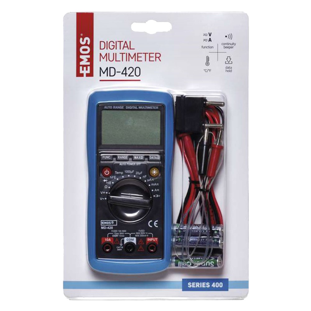 A top-of-the-line multimeter designed primarily for electrical maintenance, but meeting the criteria for semi-professional use. The multimeter can perform a wide range of AC and DC voltage and current measurements and record the measured values. Professionals will appreciate the MD-420 multimeter's ability to measure up to 1,000 A AC/DC with clamp-on currents. They will also benefit from advanced features such as diode and transistor testing. Thanks to the illuminated display , working with theAutomatic range adjustment. The audible signaling makes your work easier, and an additional advantage is the ability to measure temperatures in the range from -20 °C to +1,000 °C. The scope of delivery includes test probes, a transistor reducer, temperature probes, a transistor meter , a K-type probe, a battery cover lock, and three 1.5 V AAA batteries, making the instrument ready for immediate use. AC voltage: 2–300 V, AC current: 200 µA – 10 A/with clamp up to 1 000 A (not included), DC voltage: 200 mV – 300 V, DC current: 200 µA – 10 A/with clamp up to 1 000 A (not included), Electrical resistance: 200 Ohm – 20 MOhm, Temperature measurement: -20°C to +1 000°C, Display resolution: 3.5 digits, Dimensions: 15.8x7.5x3.5 cm. Power supply: 3× 1.5 V AAA (included)