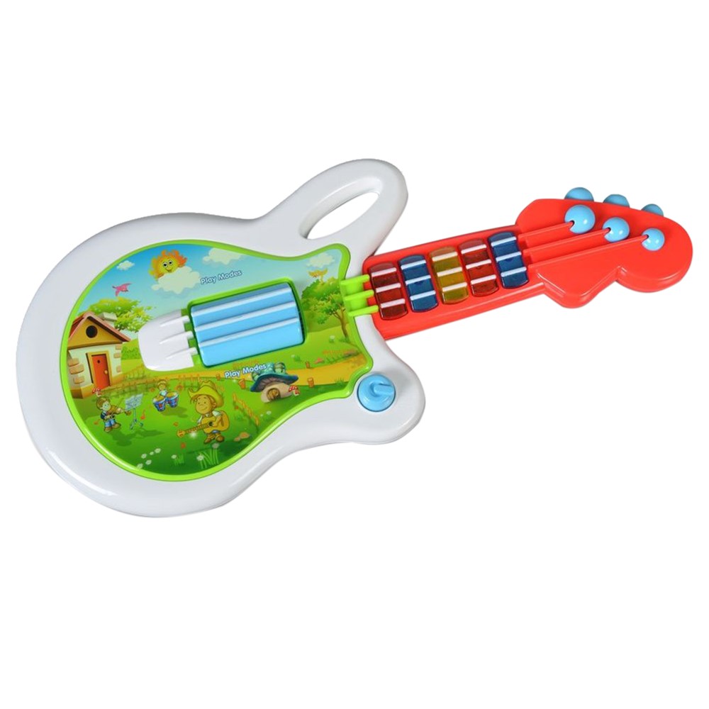Baby guitar toy made of plastic material. The game is equipped with a variety of music buttons. Easy to hold for small hands. Contributes to the easier recognition of different shapes and colors by the child, in the development of his auditory and visual perceptions. Suitable for children 12 m +