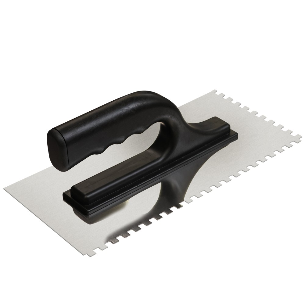 Made of special steel. Compression resistant and with high elastic properties, as it retains the starting shape despite deformations during application at work. Used for the application of glue and similar materials on medium and large application surfaces such as paving slabs, tiles for clothing, etc.