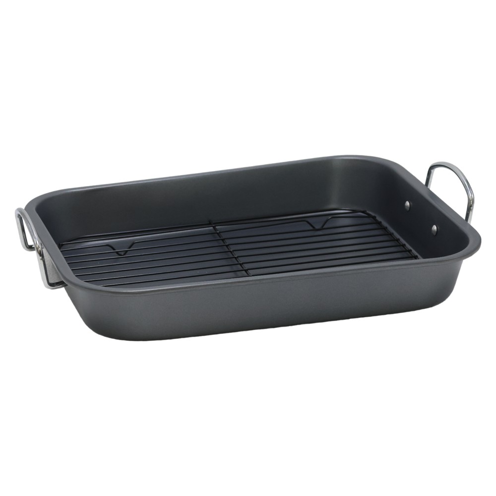 Oven pan with holder made of metal in gray color, with dimensions 29x37 cm. This product is suitable for preparing dishes with a carrier effect and serves as an excellent choice for cooking. Suitable for meat products, as it allows the juice to drain without contaminating the oven.