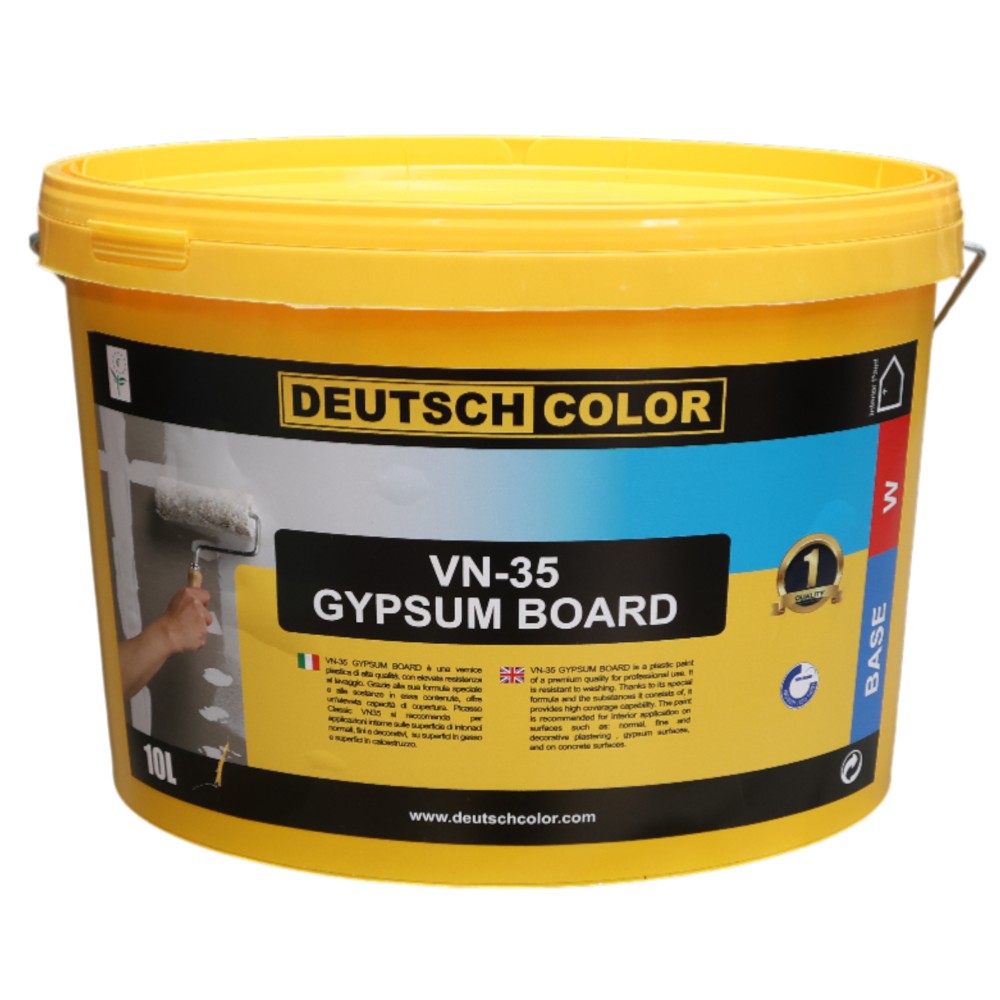 VN-35 Gypsum Board is an interior paint with high coverage and high opacity. It consists of polymers in water dispersion, selected inerts, titanium dioxide and specific additives to improve its workability. VN-35 Gypsum Board is used as an interior paint with a matt finish, applied directly on gypsum panels, lime-based finishing plaster, lime-cement, gypsum plaster and other surfaces where high coverage and good covering ability are required. It is applied by brush or roller. Dilute the VN-35 Gypsum Board product with 10-15% water, ensuring that it is completely mixed with the paint. Use a mixer to obtain a more uniform mixture. The application cycle includes the application of at least two coats of paint. The time required between two coats is 2-4 hours depending on weather conditions, temperature and humidity.