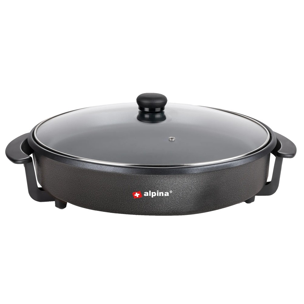 You can prepare paella, pasta, chicken, meat dishes, curries, couscous and other delicacies in this electric skillet or party pan from alpina. The pan is super multifunctional; you can even bake pizza in it. It has a non-stick coating. So no dish can fail and the pan is easy to clean because nothing sticks to it. Moreover, because of this special layer you only need to use little oil or butter. The party pan is equipped with a temperature controller. You plug this into the socket on the pan. Use the dial on the controller to select the right temperature for the dish you want to prepare. The frying pan should preheat for 5-10 minutes before you start cooking or baking. The indicator light indicates whether the pan is ready for use. You use the lid with a steam hole if you prepare meatballs, pizzas, steaks, meat, hamburgers, eggs, cake and other fried foods, for example. You don't just use this versatile pan to prepare food. You can also easily heat up a meal or bake a tortilla in it. You can also keep snacks warm in this pan during a party or other occasion. Thanks to the transparent lid, you can always check whether your dishes are still going well. The frying pan has a power of 1500 Watt.