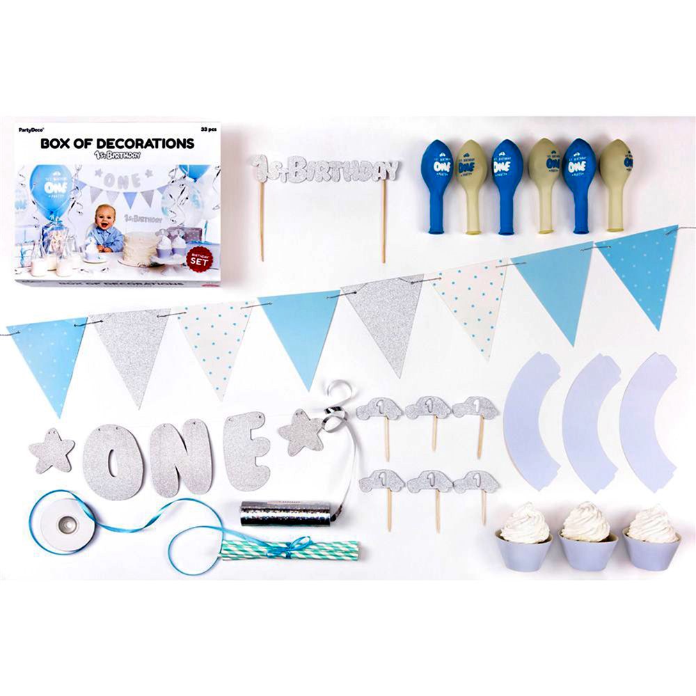 Set includes: Banner One (1 piece), paper garland (1 piece), cupcake toppers (6 pieces), blue muffin wrappers (6 p