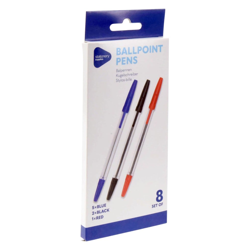 Ballpoint pen set, in blue, black and red, consisting of 8 pieces. Suitable for everyday use at work, school or at home. The pens offer clear writing, while being comfortable in the hand.