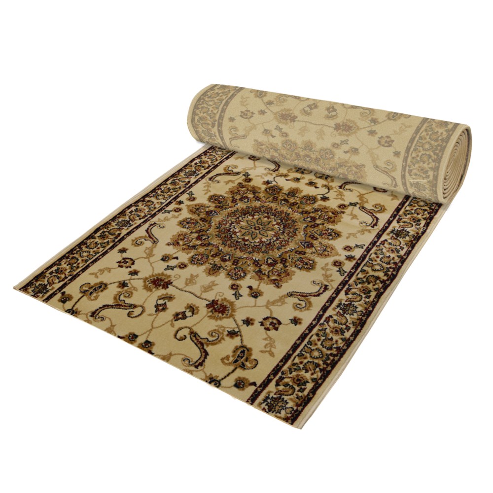Persian runner carpet with symmetric floral ornaments, as a Decorative and functional element brings elegance and warmth to your interior areas, thanks to its material composition of polypropylene fibers in combination with artificial silk which gives a natural glow that makes our product unique. Decoration with carpet is the best way to personalize your environment with stylish colors that harmonize with furniture, couches, curtains and other elements that complement the classic interior residence spaces. This type of carpet is highly suitable for areas with heavy traffic as offices etc. Easy cleaning and certified quality, style Persian carpet colors cream, beige and brown, brings maximum comfort in your home and the opportunity to be combined with any other decorative element.