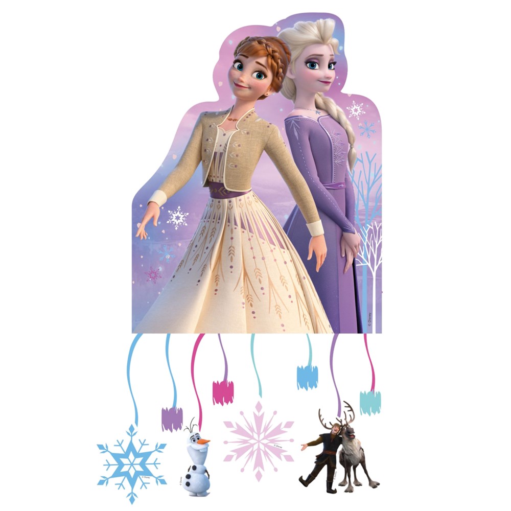 Pinata, Frozen II, is a pinata designed with a princess theme. A pinata is an object that can be filled with sweets or gifts and is traditionally part of birthday and other holiday themed parties and games. This product is suitable for use at birthday parties, themed parties with the theme of Frozen, or other festive events where it is desired to organize a fun game for children.