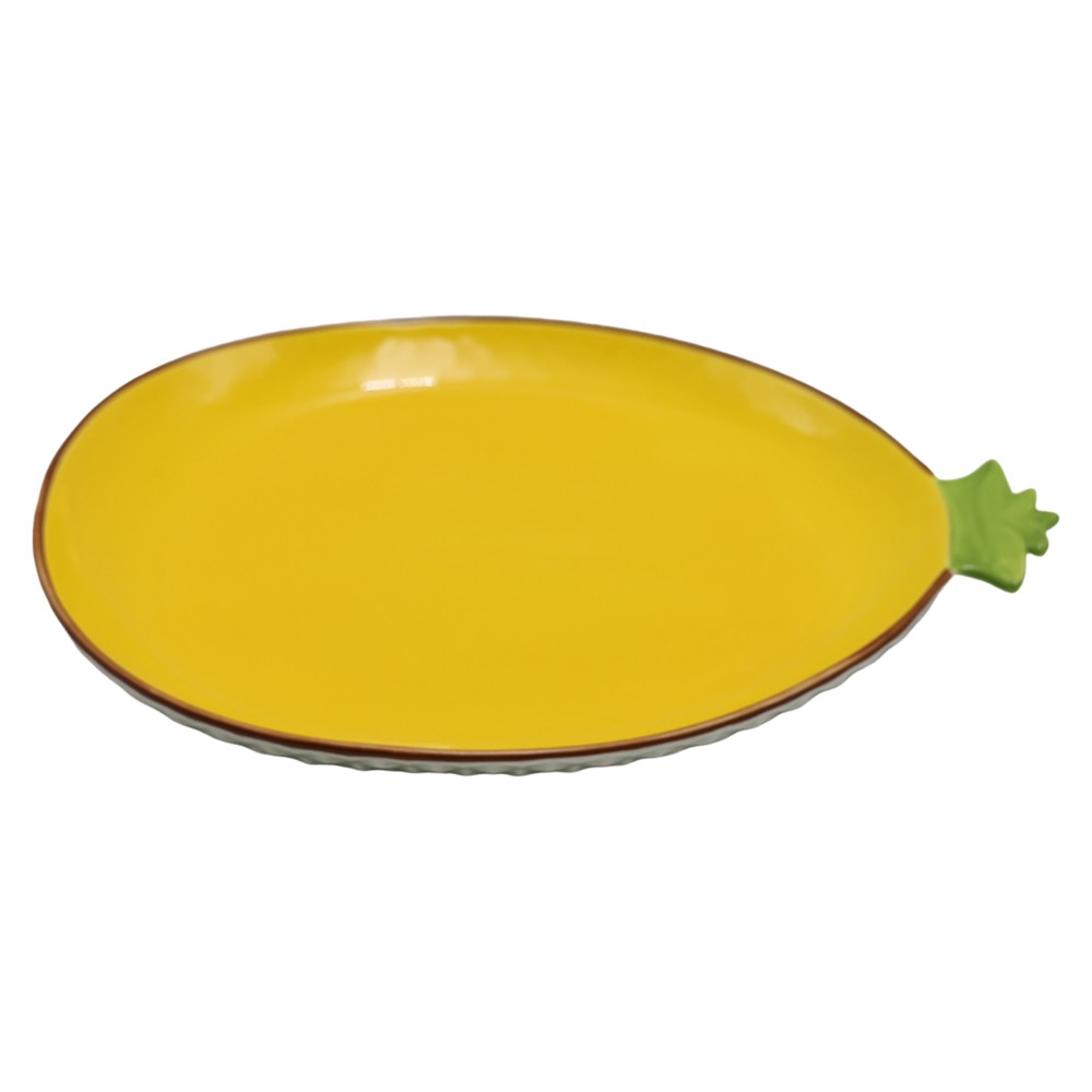Pineapple-shaped plate, made of ceramic and covered in yellow, has dimensions of 26x20 cm. This plate is designed in the shape of a pineapple, making it an attractive and unique element for the table decor or home environment. The yellow color gives it a fresh and cheerful touch, making it suitable for use on festive occasions or to add a point of interest to everyday use. Ceramic materials make it durable and suitable for everyday use.