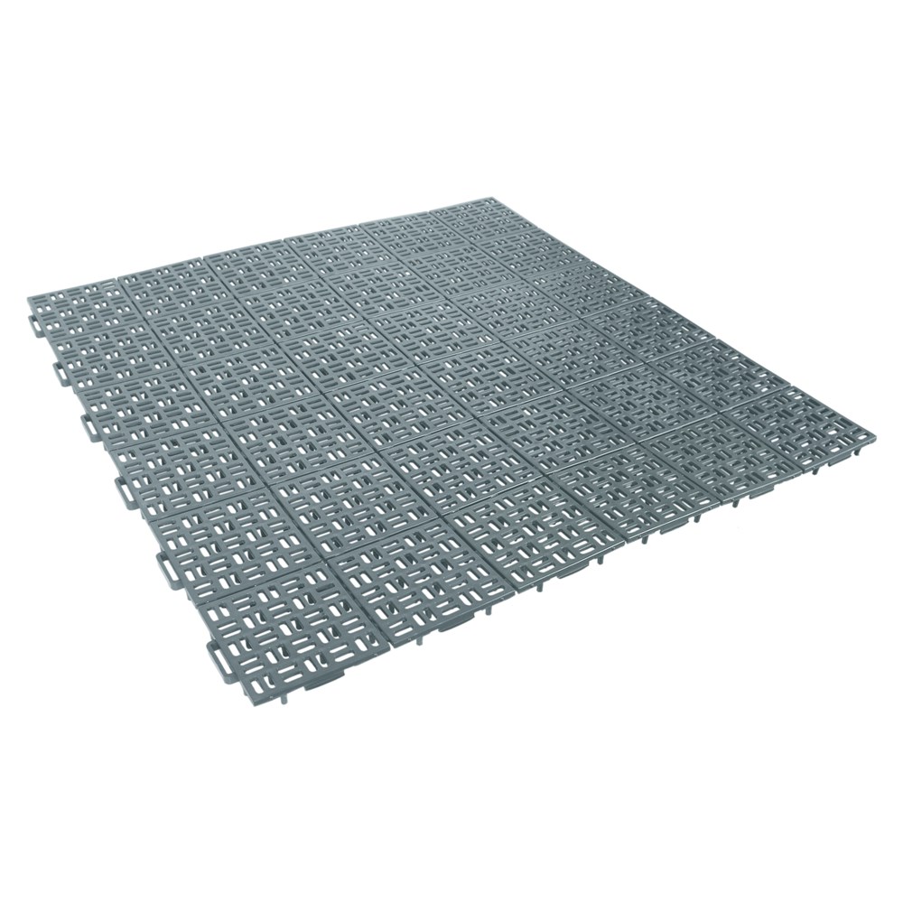 These floor tiles are fit for gardens, campings, stands and gazebos, swimming pools, walkways and greenhouses. Easy to assemble, can be mounted and demounted quickly and easily. They are weatherproof and resistant to oil and solvents. Thanks to the side hooks you can linked one the others in a staggered way, to obtain different geometric designs. They are made of polypropylene with calcium carbonate to give the product the right stiffness.