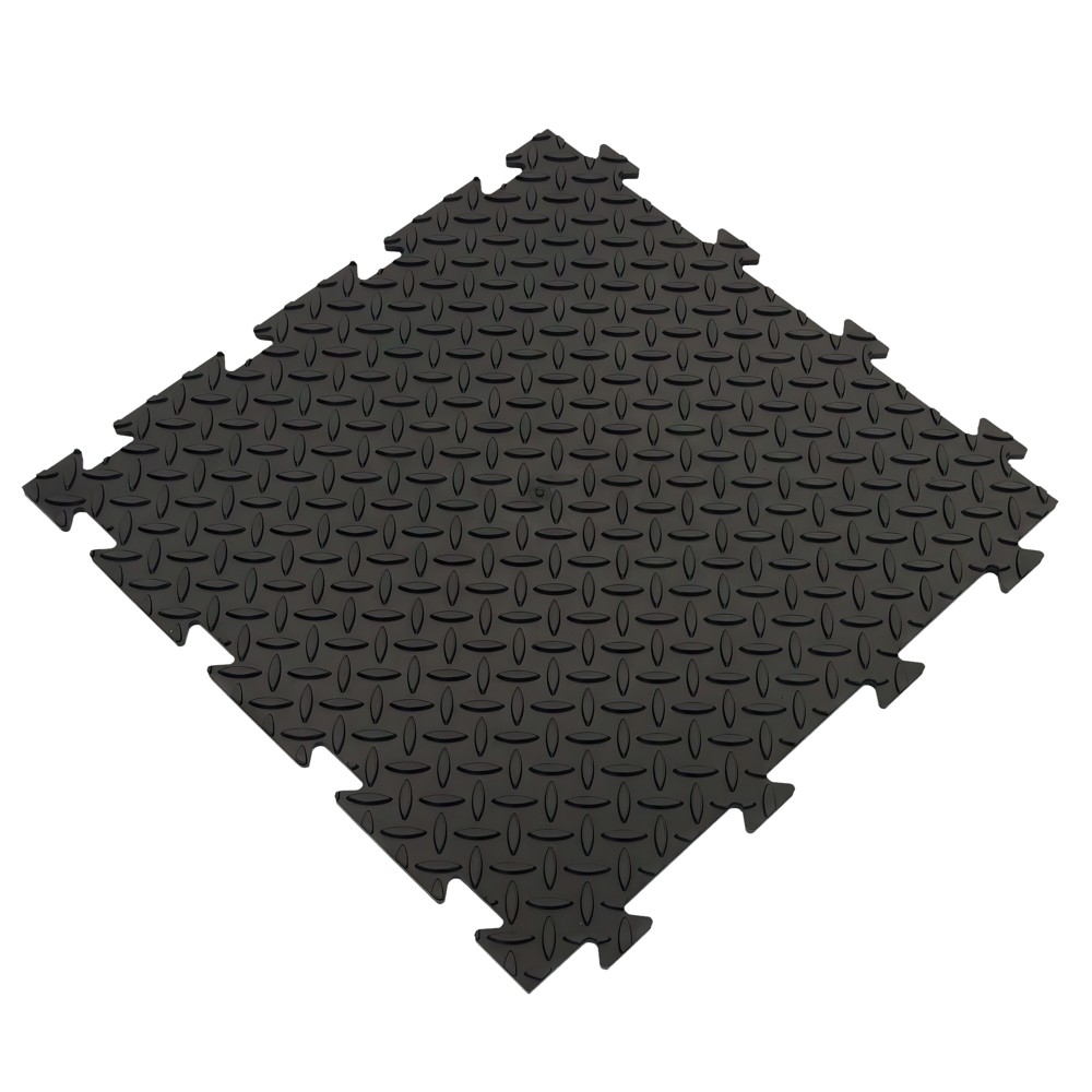 Floor tile in PVC, surface with design in relief like “grain of rice”. Fit for workshops, garages, gym centre, events, games rooms, factories, temporary floor protection, loading plane of vehicles. Caracteristics: durable and strong, easy to clean, good thermal and acoustic insulation, resistant to most chemicals and solvents, reduces damage resulting from impact and vibration, anti-slip, anti-fatigue property, quick to install and remove, protects the floor, eliminates the dust of the old concrete floor