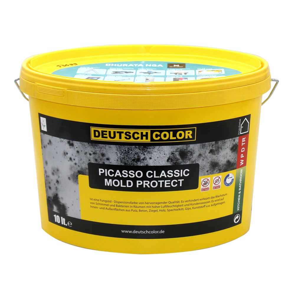 PICASSO CLASSIC MOLD PROTECT: Excellent quality mushroom destructive emulsion paint for indoor use. Prevents mold and bacteria growth, protects against dry film formation, excellent coverage, smooth matte surface, excellent workability and leveling, very strong adhesion and fast drying. Can be used in: Internal surfaces of mortar, concrete, brick, wood, mortar, gypsum, plastics etc. Areas of high humidity and condensation of vapors such as kitchens, bathrooms, ceilings, basements. Surfaces must be clean, dry and free of all defective and defective materials, powders, impurities, oils and salts. It is recommended that the painted surfaces should not be washed until 20-30 days after application. On fresh concrete surface the product is recommended to be applied at least after 30-40 days. It is recommended to avoid application of the product at temperatures below 5 ° C.