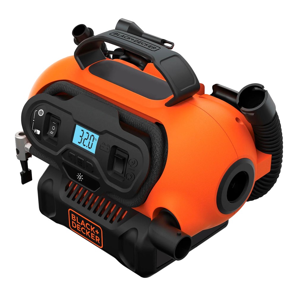 Designed with a focus on practicality and high efficiency during work. Built from the highest quality materials and intelligently built, to take up as little space as possible in your vehicle. Suitable for inflating car tires, SUVs, vans, motorcycles, etc. The compressor is also suitable for inflating products such as air mattresses, swimming pools, etc. The multifunctionality of this tool is distinguished by the many operating options, via 220 V electrical current, via the 12V car ignition socket and via Black and Decker 18 V batteries. The battery is not included in the package.