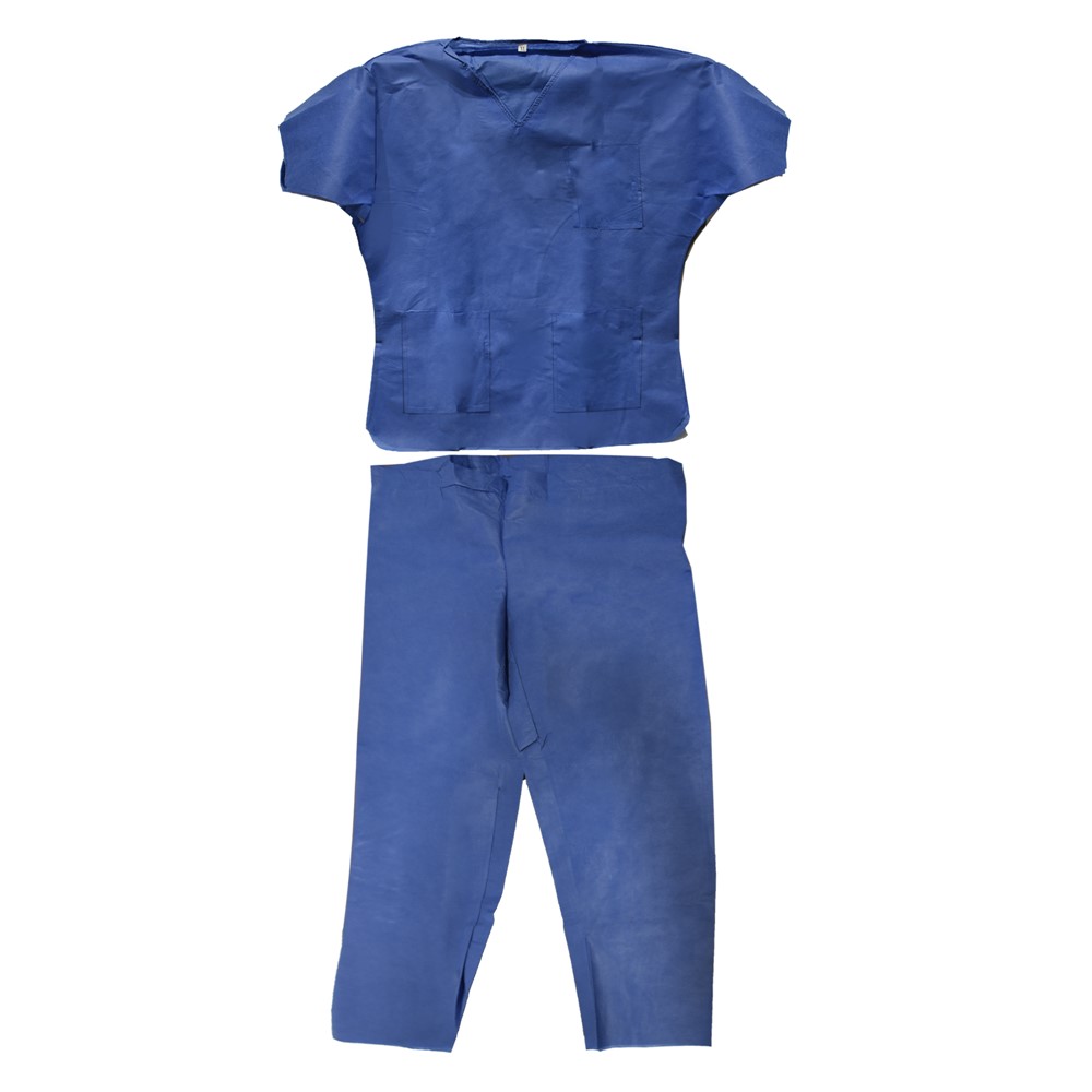 Disposable clothes, made of synthetic polyester material, which include a blouse with three pockets and a pair of pants. They are mainly used by nurses in hospitals and laboratories, to protect clothes, preventing the penetration of liquid substances, antibiotics, etc. It is recommended to use no more than 6 hours.