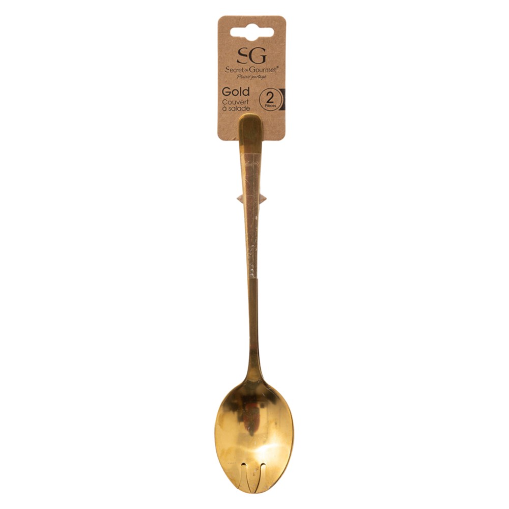 Salad service accessories made of stainless steel with a gold finish have dimensions L. 5 x P. 3 x H. 24 cm. These accessories are designed to facilitate the salad service and present them on the table.