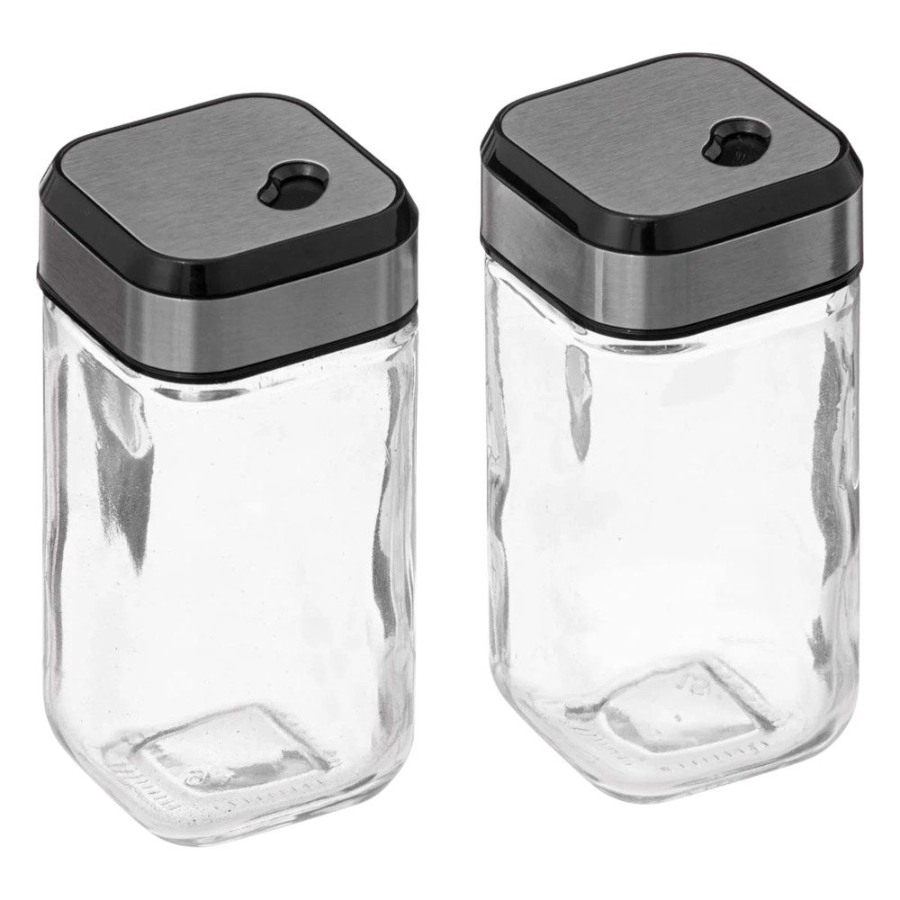Salt and pepper shaker set made of transparent glass with gray plastic lid. They have a capacity of 100 ml. The cap has 3 different modes. Salt and pepper are the main elements for the middle of the table during the meal.