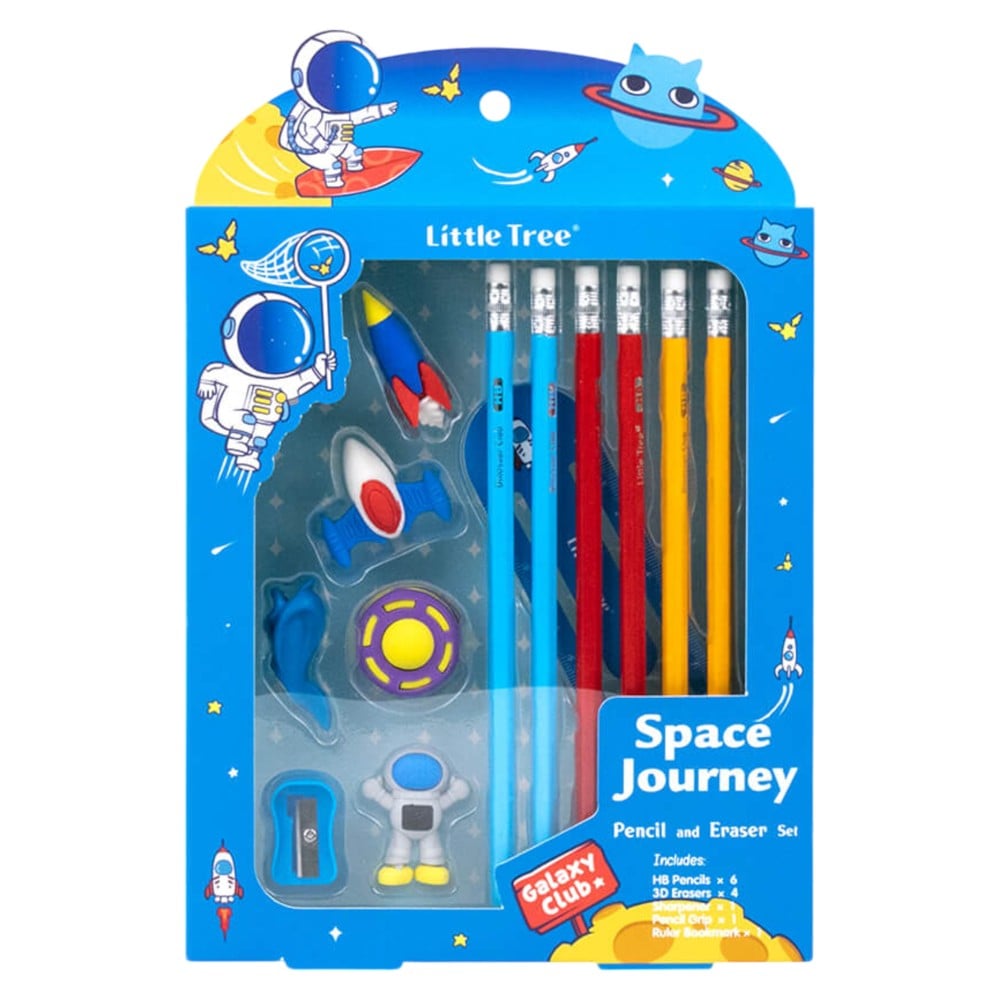 Space Journey school set, including pencils and erasers. This specially designed set for kids offers pencils and erasers, all in mixed colors and space motifs, making school materials more fun and engaging.