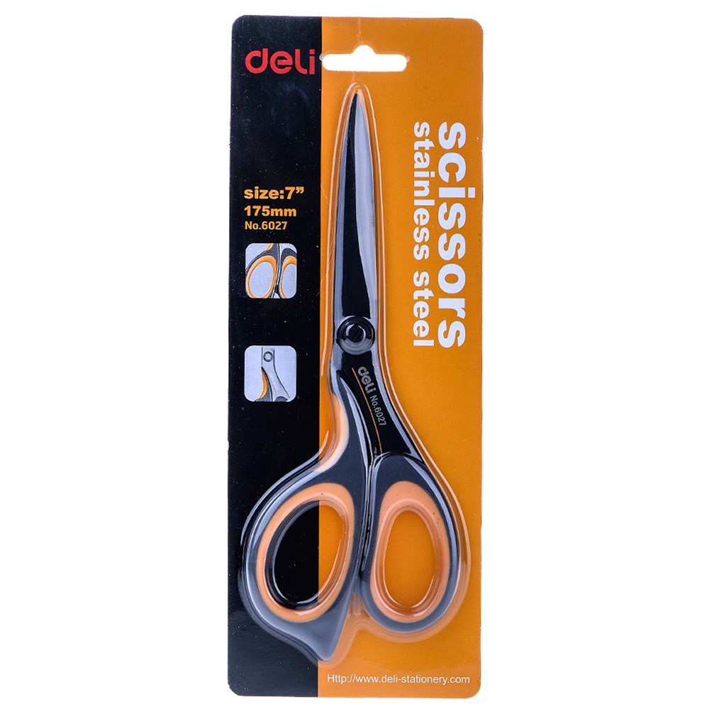 Scissors, model no. 6027, made of durable stainless steel material, with 17.5 cm length, with plastic handle, in black, yellow and gray color. The handle has soft rubber coating, with ergonomic properties for easier use. It is used for cutting paper and thin cardboard, as well as for cutting wrapping paper, textile pieces, etc. This product is suitable for professional and non-professional use.