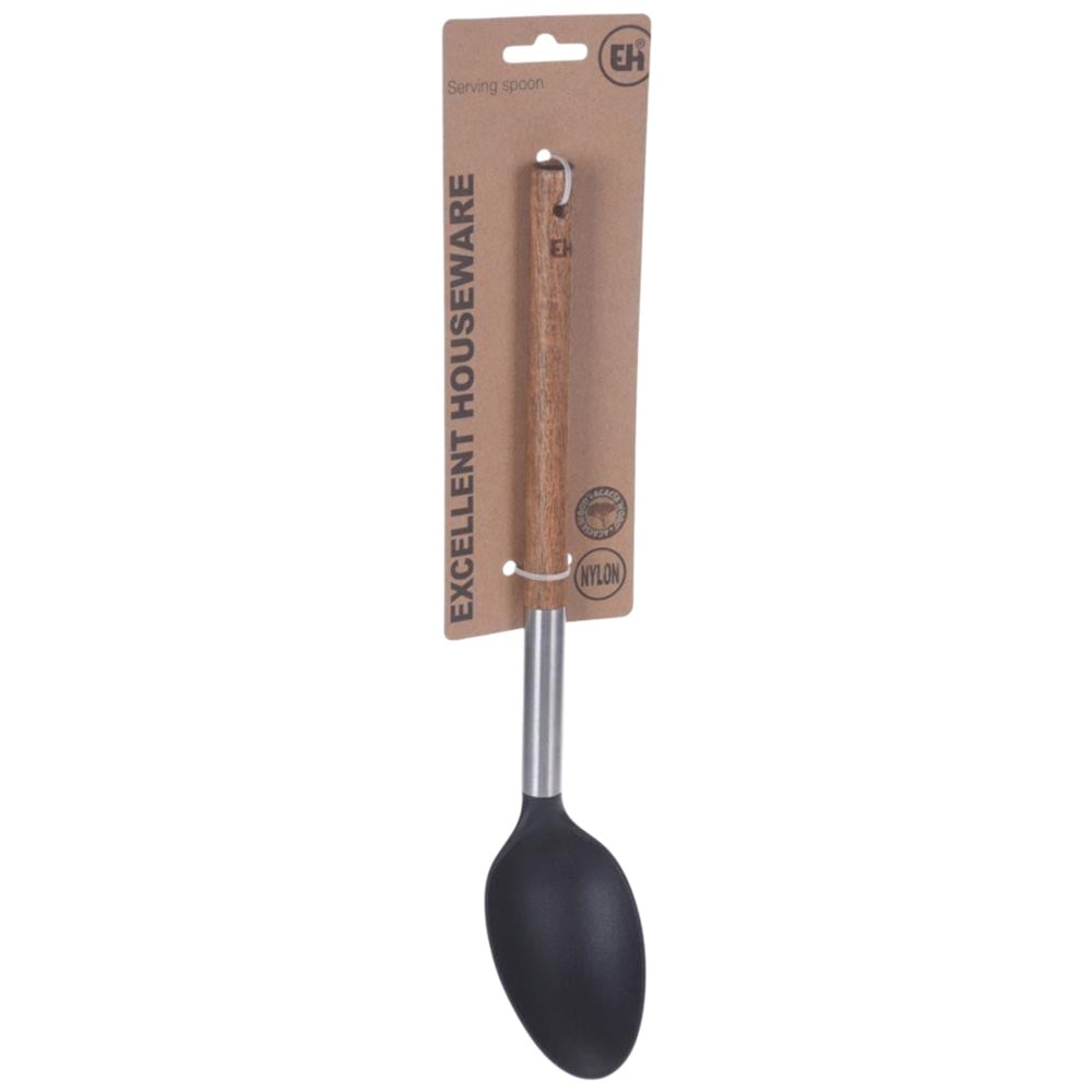 Kitchen spoon for mixing and serving dishes. This spoon is made of high-quality nylon, which makes it resistant to damage and high temperatures up to 210°C. The handle is made of acacia wood and steel, ensuring durability and a warm aesthetic touch. Also safe for use with glassware.